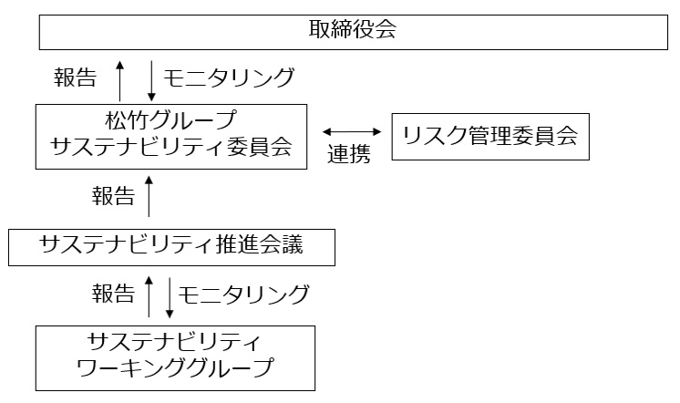 松竹グループのサステナビリティ対応推進のため、基本方針や重要事項についての検討、審議の場として、サステナビリティ委員会を設置しております。