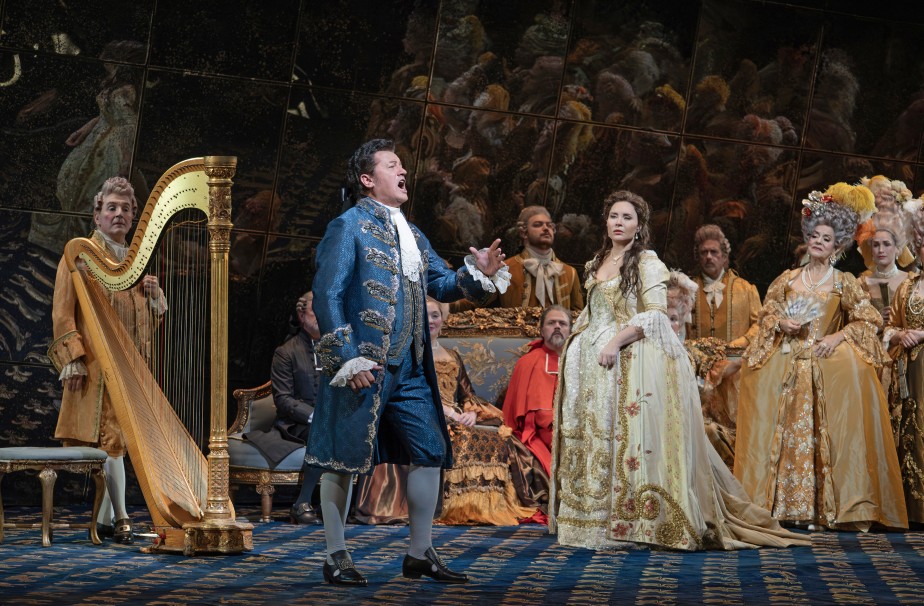 フランス革命を舞台に、理想に燃えながら断頭台に散った実在の詩人と、相思相愛の伯爵令嬢、彼女に思いを寄せる革命家。それぞれの葛藤がヴェリズモ(真実主義)のダイナミックな音楽で描かれる、歴史好きも必見の名作がMETLV初登場。演出N・ジョエルの正攻法の舞台で、題名役P・ベチャワと伯爵令嬢役S・ヨンチェヴァという当代きってのスター歌手が、名アリアの数々を交えて情熱的に演唱し、俊英D・ルスティオーニの指揮が引き締める。