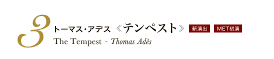 ミラノ大公プロスペローは、弟アントーニオに地位を奪われて追放され、流れ着いた孤島で娘のミランダと暮らしていた。魔法の力を手に入れたプロスペローは、妖精アリエルに命じて嵐を起こし、アントーニオとナポリ王のアロンゾが乗った船を難破させ、孤島に漂着させる。ナポリ王子フェルディナンドはミランダと恋に落ち、プロスペローの試練を経て彼女と結ばれる。プロスペローはアリエルを操って公国を取り戻し、魔法の力を捨てる。 「ブリテンの再来」と名高い、イギリスが生んだ21世紀の天才T・アデスが32歳の若さで発表した傑作。シェイクスピア最後の戯曲に基づいたファンタジックな世界を、〈ニーベルングの指環〉で世界を席巻したR・ルパージュが演出する!主役のプロスペローには、2004年の初演以来この役で大成功を収めるイギリスの名バリトン、S・キーンリーサイド。METの《テンペスト》を観ずして、これからのオペラは語れない!