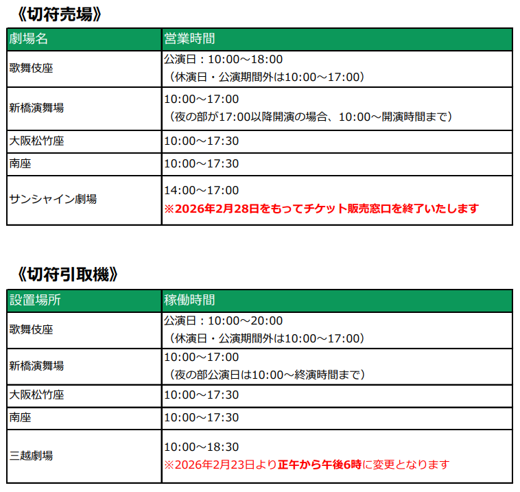 平素は格別のご高配を賜り、厚く御礼申し上げます。 劇場窓口・切符引取機の営業時間は下記の通りとなります。 ※こちらは基本の営業時間です。 ※年末年始の期間や公演により営業時間が異なる場合がございます。