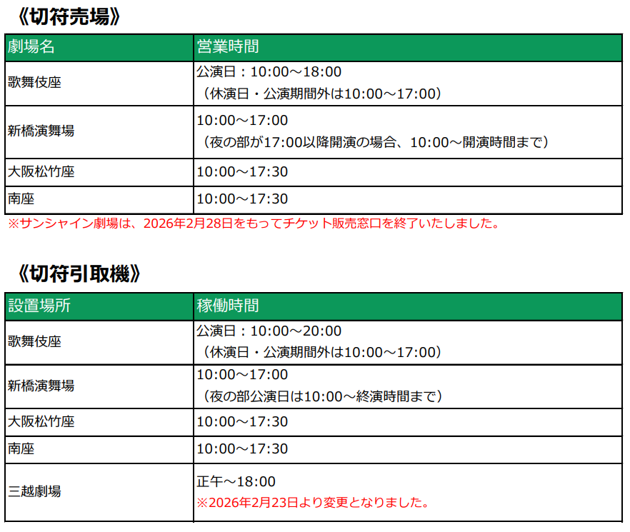 平素は格別のご高配を賜り、厚く御礼申し上げます。 劇場窓口・切符引取機の営業時間は下記の通りとなります。 ※こちらは基本の営業時間です。 ※年末年始の期間や公演により営業時間が異なる場合がございます。