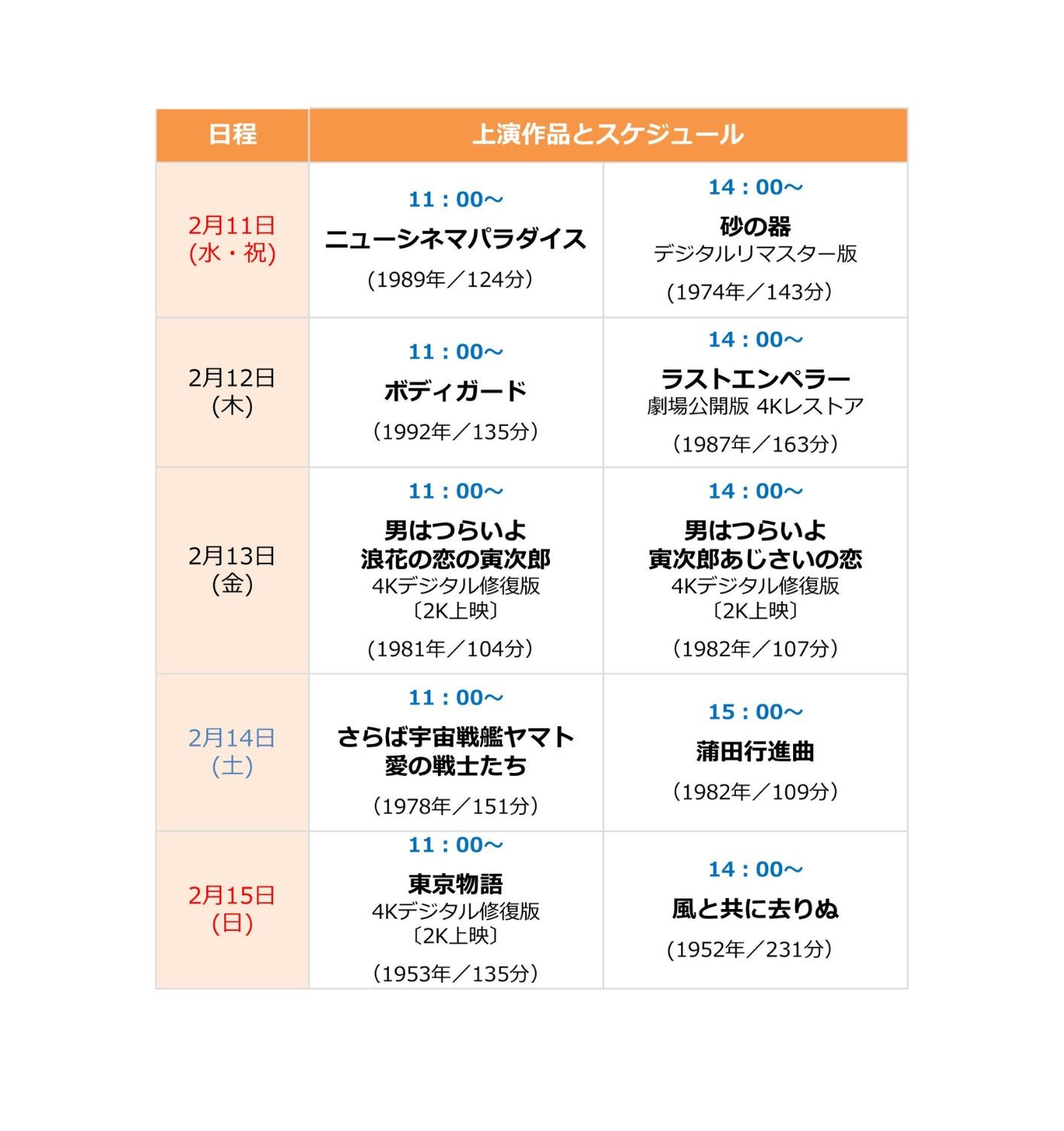 邦画作品は、人間の宿命と親子の絆を壮大なスケールで描いた野村芳太郎監督作品「砂の器」、家族の姿を通して日本人の心の原風景を静かに見つめた小津安二郎監督作品「東京物語」、日本中を笑いと涙で包み込んだ山田洋次監督作品「男はつらいよ」シリーズを上映。さらに、銀幕に生きる人々の情熱と映画愛を描いた深作欣二監督作品「蒲田行進曲」など、松竹映画の不朽の名作をお届けします。また、アニメーションの枠を超え、壮大なSFロマンとして、アニメの社会的認知を高めた歴史的傑作「宇宙戦艦ヤマト 愛の戦士たち」も上映いたします。