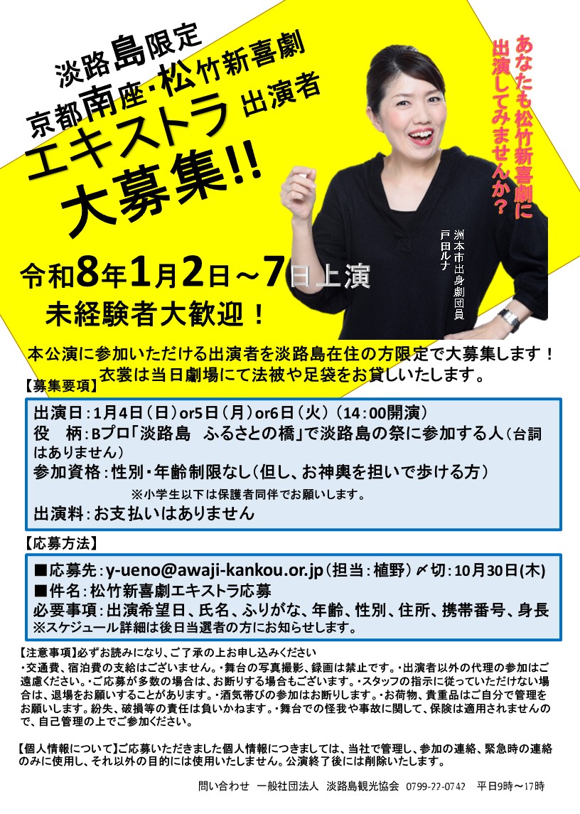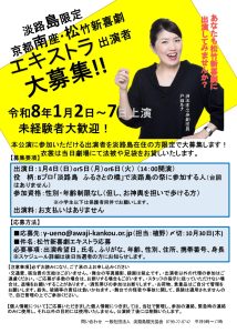 令和8年1月南座公演にて、淡路島在住の方限定でエキストラ出演者を募集いたします!